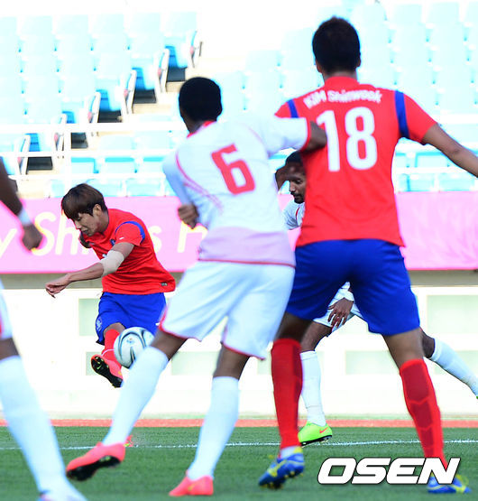 10일 오후 경기도 안산와스타디움에서 열린 아시안게임 대한민국 대표팀 과 UAE의 경기, 대한민국 윤일록이 슈팅을 시도하고 있다.