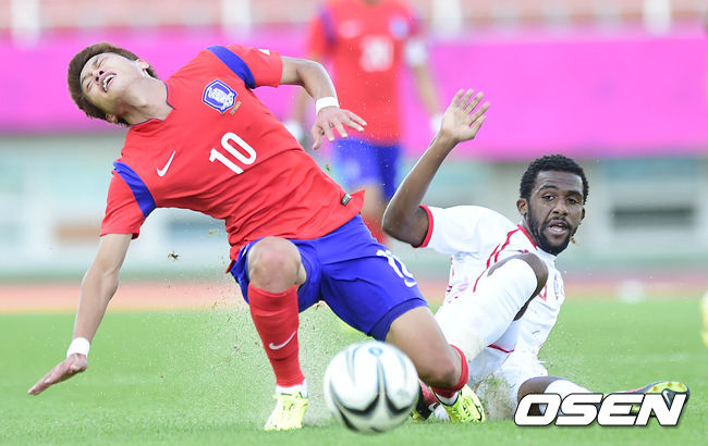 10일 오후 경기도 안산와스타디움에서 열린 아시안게임 대한민국 대표팀 과 UAE의 경기, 후반전 대한민국 김승대가 깊은 태클에 쓰러지고 있다.