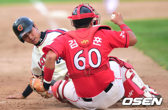 8회말 1사 1,2루 장성우의 좌익수 안타때 홈으로 달리던 김문호가 홈에서 태그아웃 되고 있다.