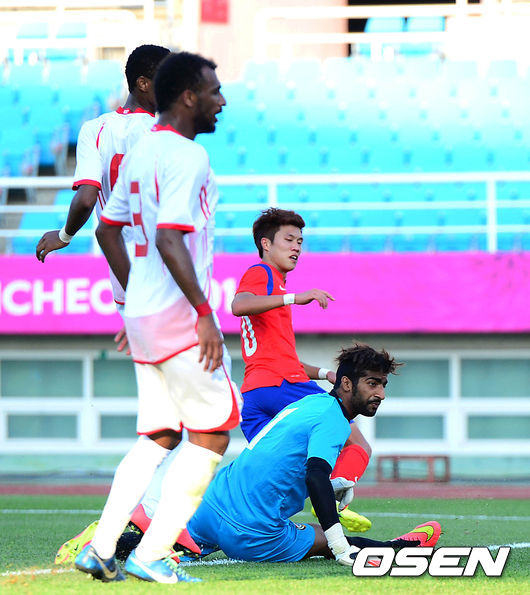 10일 오후 경기도 안산와스타디움에서 열린 아시안게임 대한민국 대표팀 과 UAE의 경기, 후반전 대한민국 김승대가 역전골을 성공시키고 골망을 확인하고 있다.