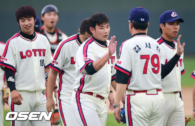 경기종료 후, 승리한 롯데 선수들이 김시진 감독과 하이파이브를 나누고 있다. /ouxou@osen.co.kr