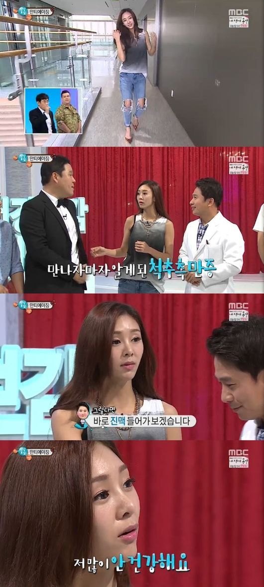 건강미녀인 것처럼 보였던 지나였지만, 스튜디오에 들어온 그는 "(척추가 비뚤어진 것을) 어떻게 아셨나? 척추측만증이 있다", "나 많이 안 건강하다. 굽은어깨도 있고 척추측만증, 골다공증, 저혈압이 있다"고 말하며 다소 나쁜 건강상태를 밝혔다.
