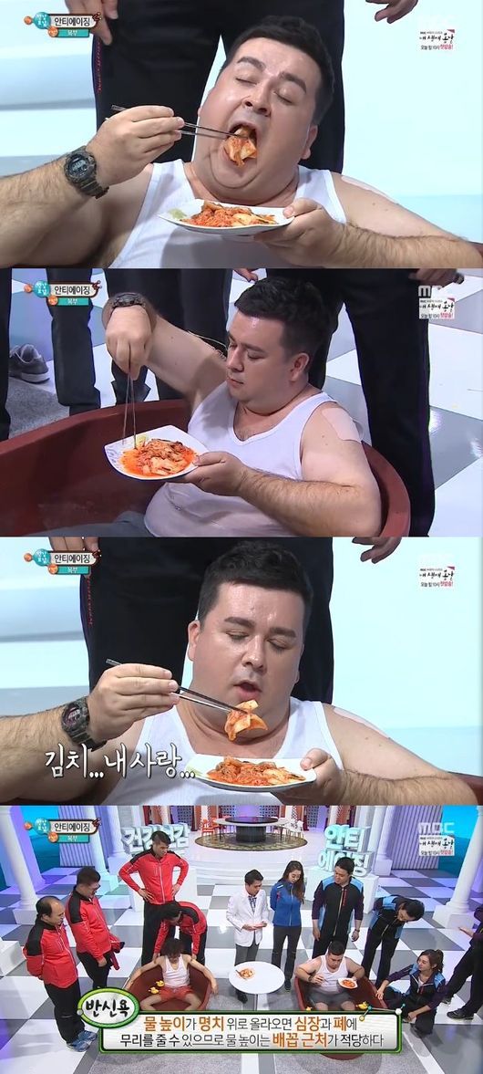 이날 김문호 원장은 샘 해밍턴과 조정치의 복부 건강을 체크한 뒤 복부 안티에이징에 좋은 반신욕을 제안했다. 이에 조정치와 샘 해밍턴은 스튜디오에 준비된 고무 대야 속에 들어가 반식욕을 즐겼고 옆에 준비된 김치를 맛있게 먹었다.