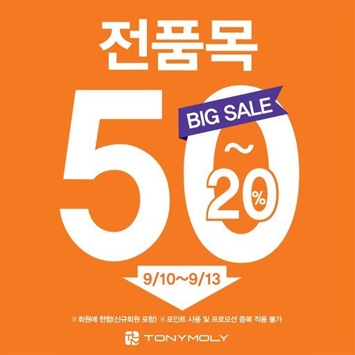 할인을 받기 위해서는 멤버십 회원에 가입을 해야 한다. 세일이 적용된 제품은 포인트 적립이 되지 않는다. 이 밖에 토니모리는 9월 신제품을 구입하면 20% 할인해주는 행사 등을 진행할 예정이다.