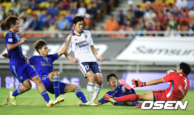 후반 수원 선수들이 울산 유준수의 슈팅을 막으려 하고 있다./greenfield@osen.co.kr