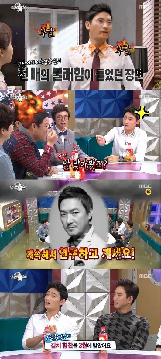 원기준은 10일 오후 방송된 MBC 예능프로그램 '황금어장-라디오스타'(이하 '라스')에서 김치 따귀에 대해 "3월에 협찬을 받았다. 얼마나 쉬었겠느냐. (상대역이 김치를 잡는데) 오래 걸리셨다. 선생님께 여쭤봤다. 때리기 좋게 잡느라고 윗부분이 말라서 물을 묻혀서 하셨다. 한 번에 OK가야하니까"라고 당시를 회상했다.