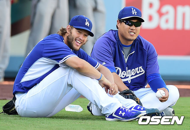 경기에 앞서 다저스 커쇼, 류현진이 훈련도중 외야에서 이야기를 나누고 있다.