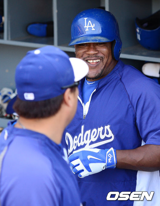 경기에 앞서 다저스 류현진이 더그아웃에서 유리베와 이야기를 나누며 즐거워하고 있다.