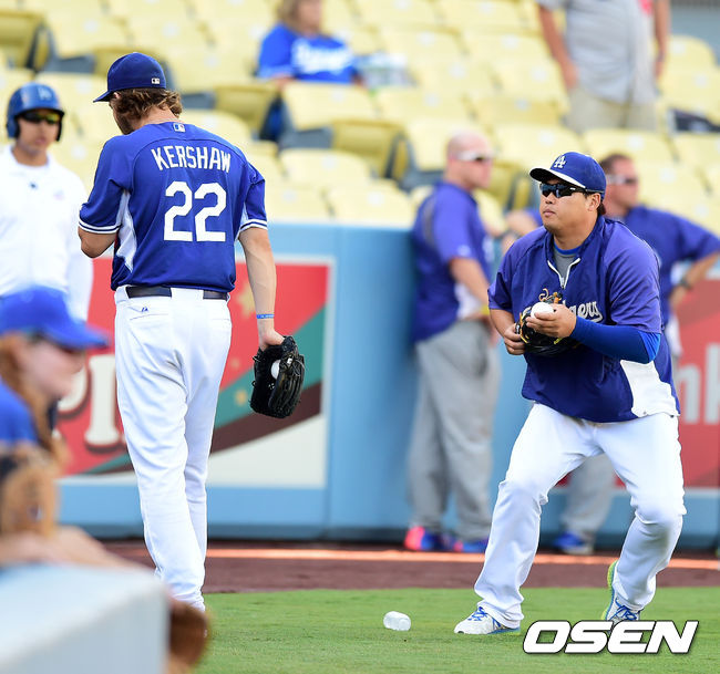 경기에 앞서 다저스 커쇼와 류현진이 캐치볼을 준비하고 있다.