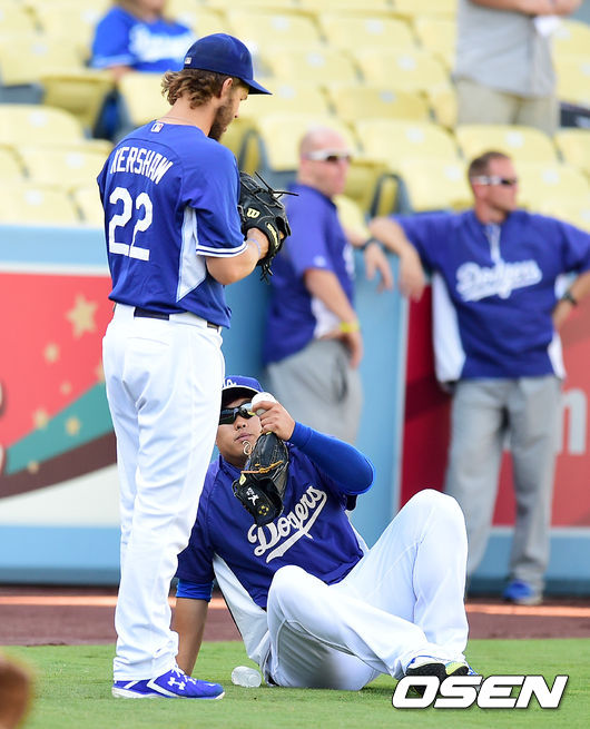 경기에 앞서 다저스 커쇼와 류현진이 외야에서 캐치볼을 준비하고 있다.