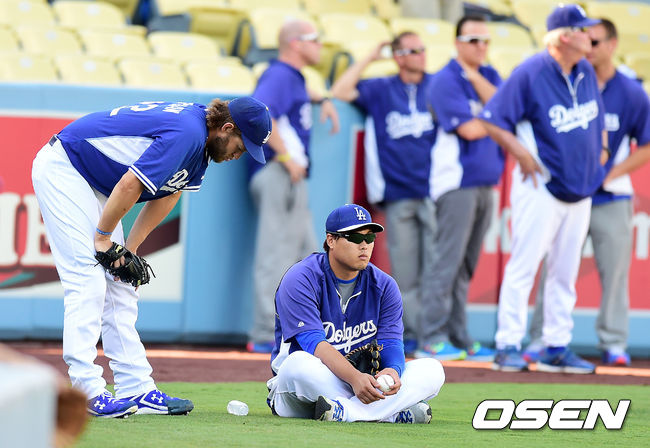 경기에 앞서 다저스 커쇼, 류현진이 외야에서 훈련 도중 휴식을 취하고 있다.