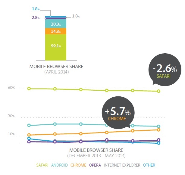 모바일 브라우저(Mobile browsers)는 2013년 12월 조사치에 비해 2014년 5월에는 크롬 모바일(Chrome Mobile)의 시장 점유율이 5.7% 상승해 34.6%가 된 반면, 사파리 모바일(Safari Mobile)은 59.1%로 2.6% 하락했다. 기기별로는 애플 아이폰(iPhone)과 아이패드(iPad)는 각각 54%와 80%의 점유율로 여전히 최고의 모바일 웹 방문 수를 이끌고 있다. 삼성은 스마트폰에서의 브라우징(24%)과 태블릿에서의 브라우징(7%) 모두에서 2위를 차지했다. 아마존은 태블릿을 통한 모바일 브라우징에서 5%의 점유율을 기록해 3위를 차지했다.