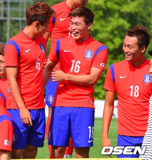 11일 경기도 파주 NFC(국가대표축구트레이닝센터)에서 진행된 한국 아시안게임 축구대표팀 포토데이 행사에서 손준호와 이종호가 이야기를 나누고 있다.