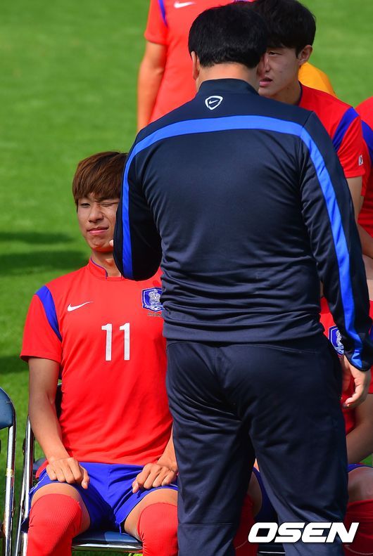 11일 경기도 파주 NFC(국가대표축구트레이닝센터)에서 진행된 한국 아시안게임 축구대표팀 포토데이 행사에서 윤일록이 이운재 코치에게 알밤을 맞고 있다.