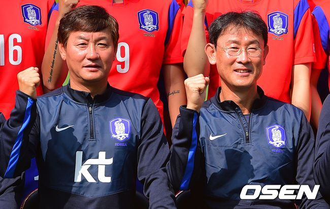 11일 경기도 파주 NFC(국가대표축구트레이닝센터)에서 진행된 한국 아시안게임 축구대표팀 포토데이 행사에서 남자대표팀 이광종 감독과 여자대표팀 윤덕여 감독이 포즈를 취하고 있다