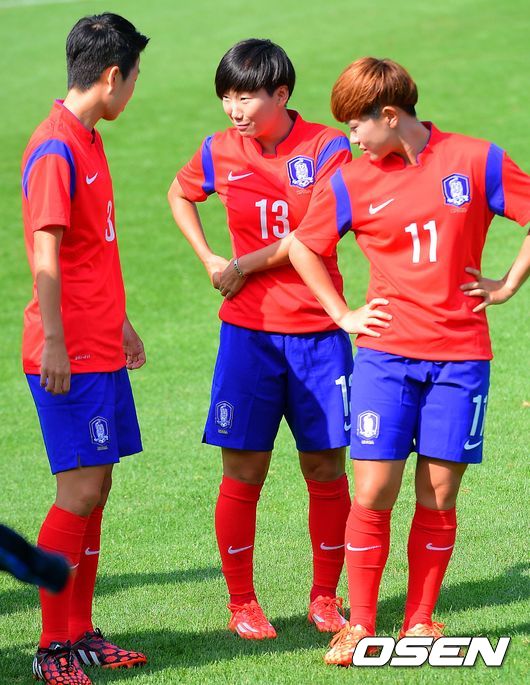 11일 경기도 파주 NFC(국가대표축구트레이닝센터)에서 진행된 한국 아시안게임 축구대표팀 포토데이 행사에서 권하늘과 박희영이 포즈 연습을 하고 있다