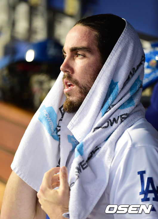 1회초 수비를 마친 다저스 댄 하렌이 더그아웃에서 땀을 닦고 있다.