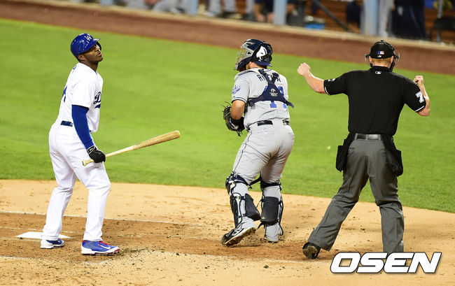 2회말 2사 만루에서 다저스 푸이그가 삼진으로 물러나며 아쉬워하고 있다.