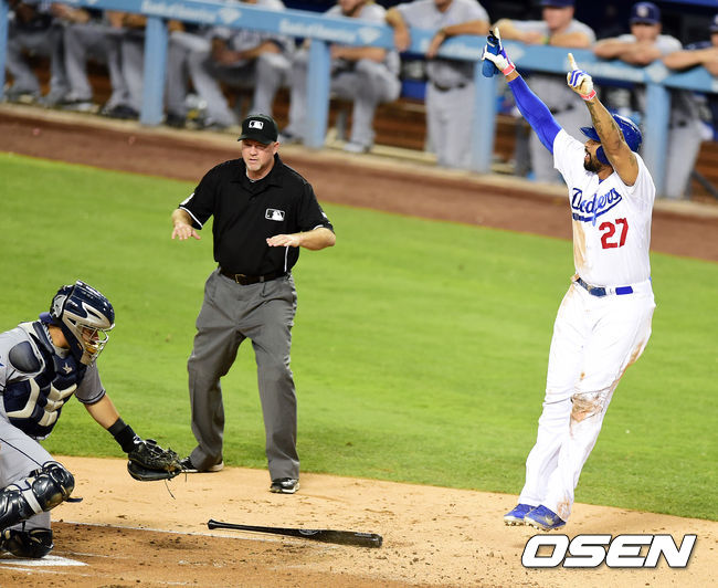 2회말 1사 1루에서 다저스 맷 켐프가 크로포드의 선제 1타점 좌중간 2루타에 홈에서 세이프되며 기뻐하고 있다.