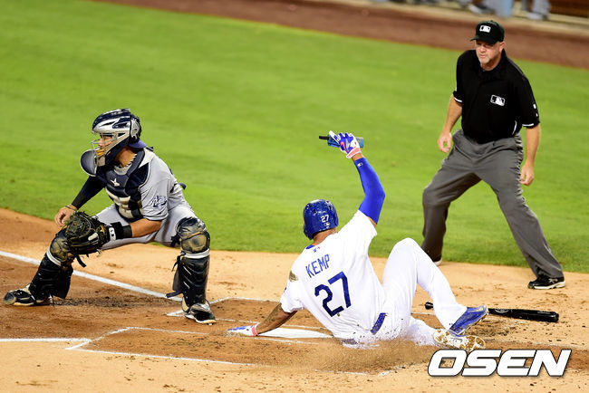2회말 1사 1루에서 다저스 맷 켐프가 크로포드의 선제 1타점 좌중간 2루타에 홈에서 세이프되고 있다.
