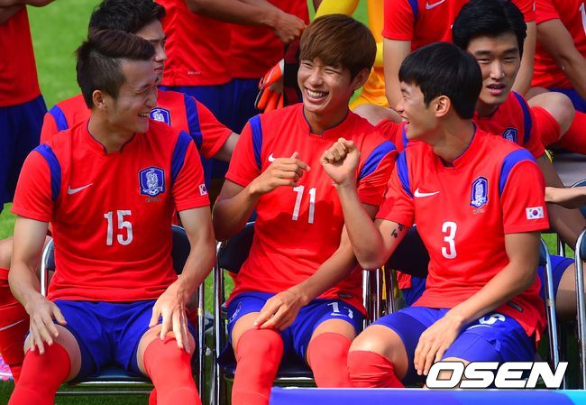 11일 경기도 파주 NFC(국가대표축구트레이닝센터)에서 진행된 한국 아시안게임 축구대표팀 포토데이 행사에서 윤일록과 김진수, 임창우가 이야기를 나누고 있다