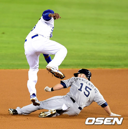 5회초 2사에서 샌디에이고 1루주자 스팽겐버그가 다저스 라미레즈에 태그 당하며 2루 도루에 실패하고 있다.