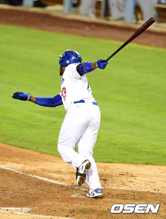 6회말 2사 3루에서 다저스 라미레즈가 1타점 적시타를 날리고 타구를 바라보며 1루로 향하고 있다.