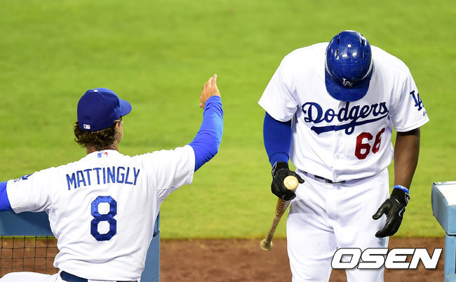7회말 1사 1,3루에서 다저스 푸이그가 삼진으로 물러나자 매팅리 감독이 격려하고 있다.