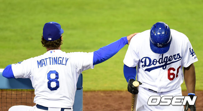 7회말 1사 1,3루에서 다저스 푸이그가 삼진으로 물러나자 매팅리 감독이 격려하고 있다.