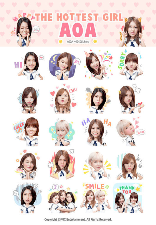 ‘더 핫티스트 걸 에이오에이(The Hottest Girl AOA)’라는 이름으로 출시된 이번 스티커 이모티콘은 총 40종으로 구성돼 있으며, 멤버 한 명 한 명의 리얼하고 익살스러운 표정이 생생히 살아있어 카카오톡 메신저 유저들에게 큰 사랑을 받을 것으로 기대된다.