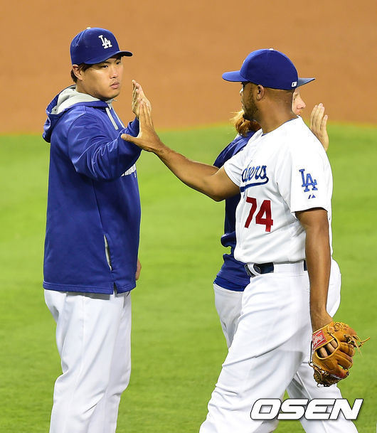 경기후 다저스 류현진이 잰슨과 하이파이브를 하고 있다./ jpnews@osen.co.kr