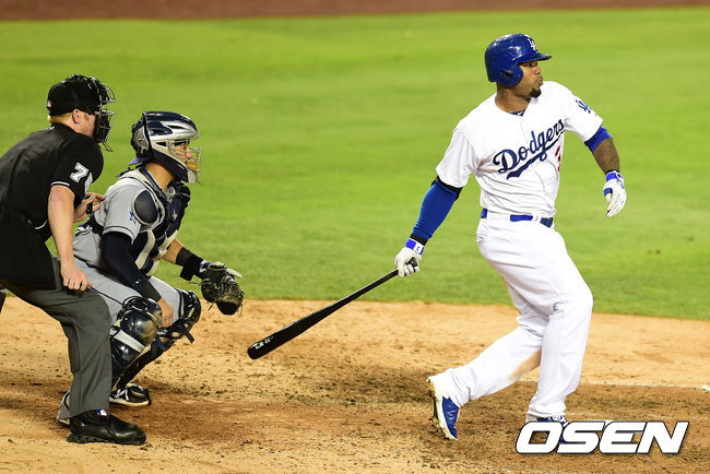 8회말 2사 1루에서 다저스 칼 크로포드가 1타점 적시 2루타를 날리고 있다. 크로포드는 2루타 3개 포함, 4안타 2타점 1득점으로 타선을 이끌었다. / jpnews@osen.co.kr