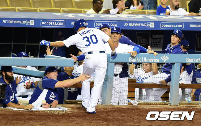 8회말 2사 1루에서 다저스 바니가 크로포드의 1타점 적시 2루타에 홈을 밟으며 더그아웃에서 매팅리 감독을 비롯한 동료선수들과 하이파이브를 하고 있다. 크로포드는 2루타 3개 포함, 4안타 2타점 1득점으로 타선을 이끌었다./ jpnews@osen.co.kr
