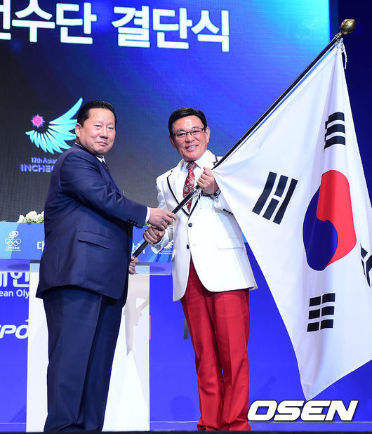 11일 오후 서울 올림픽공원 올림픽홀에서 열린 제17회 인천아시아경기대회 대한민국 선수단 결단식에서 김정행 대한체육회장이 박순호 선수단장에게 단기를 건내고 있다.