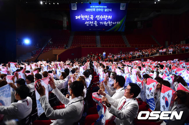11일 오후 서울 올림픽공원 올림픽홀에서 열린 제17회 인천아시아경기대회 대한민국 선수단 결단식에서 선수들이 태극기 스카프를 흔들고 있다.
