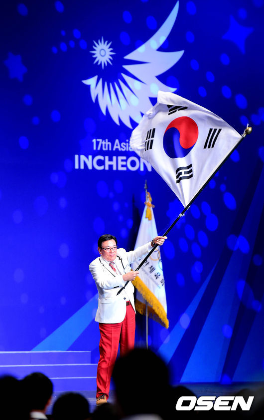 11일 오후 서울 올림픽공원 올림픽홀에서 열린 제17회 인천아시아경기대회 대한민국 선수단 결단식에서 박순호 선수단장이 단기를 흔들고 있다.