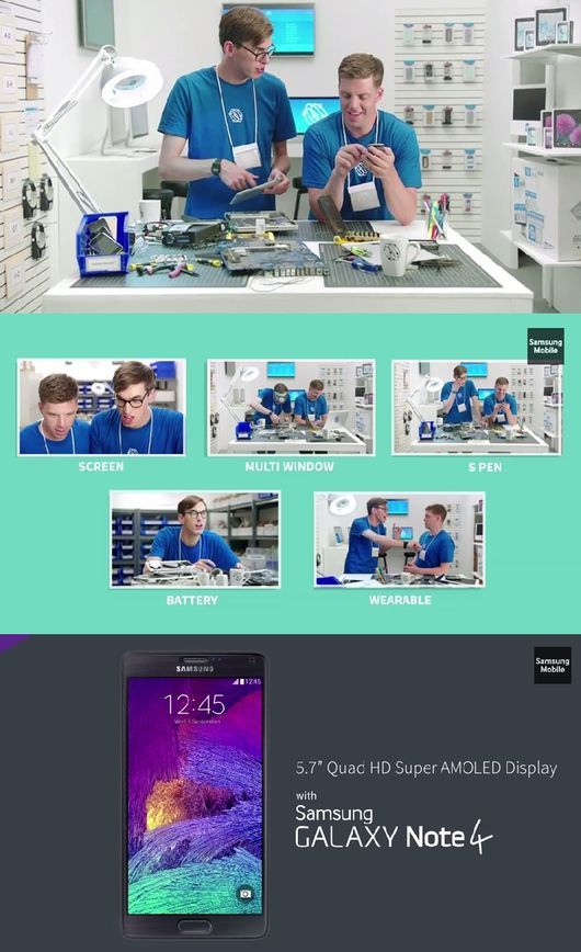 광고에는 IT기기에 관심있는 두 청년이 등장해 일체형 배터리, 대화면 디스플레이, S펜의 부재, 멀티 윈도우 기능, 스마트워치 등 여러 방면에서 아이폰6보다 갤럭시 노트4가 낫다는 점을 부각시킨다.