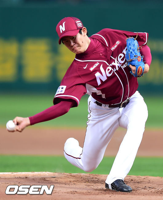 1회말 넥센 선발 김대우가 힘차게 공을 뿌리고 있다.