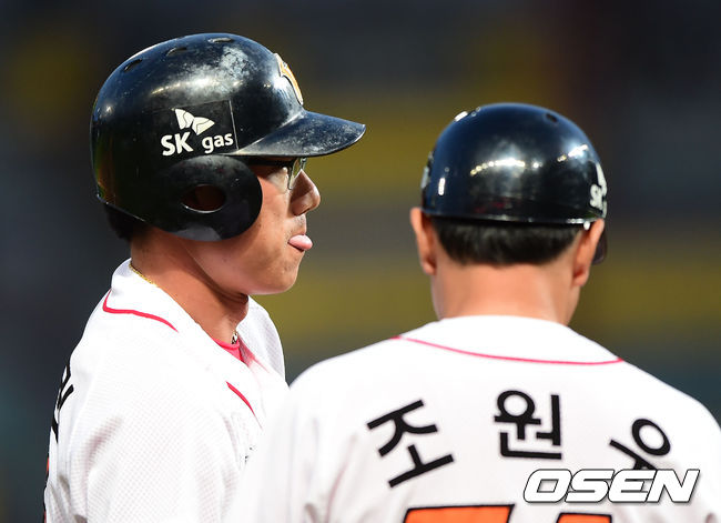 1회말 1사 1,2루 2타점 적시타를 때린 박정권이 3루에서 SK 덕아웃쪽을 바라보고 있다.