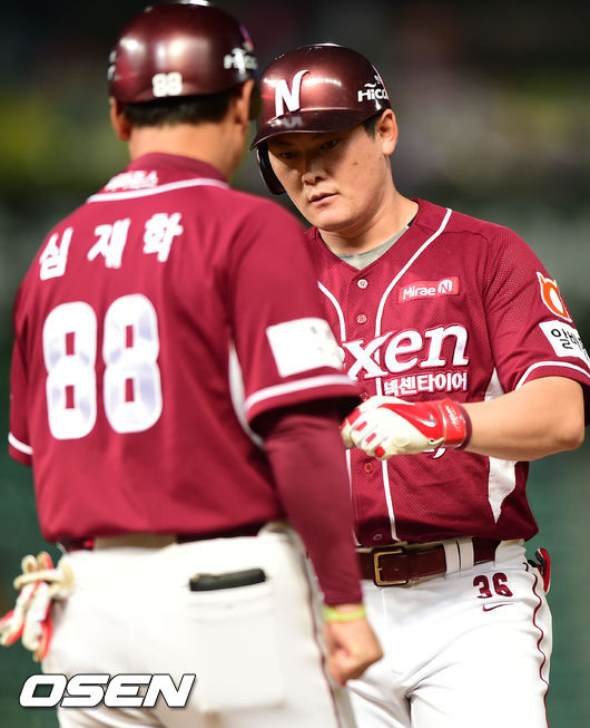 4회초 2사 1,2루 1타점 적시타를 날린 이성열이 1루에서 심재학 코치와 하이파이브를 나누고 있다.