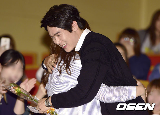 11일 오후 서울 성북구 성신여자대학교 운정그린캠퍼스 대강당에서 열린 영화 '제보자' 쇼케이스에서 배우 유연석이 쇼케이스를 찾은 팬에게 꽃을 선사하고 포옹을 하고 있다.