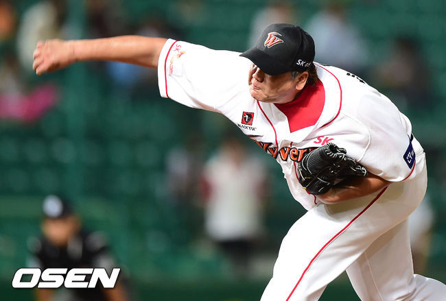 7회초 SK 선발 채병용이 힘차게 공을 뿌리고 있다.