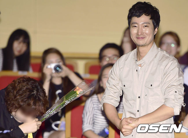 11일 오후 서울 성북구 성신여자대학교 운정그린캠퍼스 대강당에서 열린 영화 '제보자' 쇼케이스에서 배우 박해일이 팬에게 꽃을 선물하고 있다.