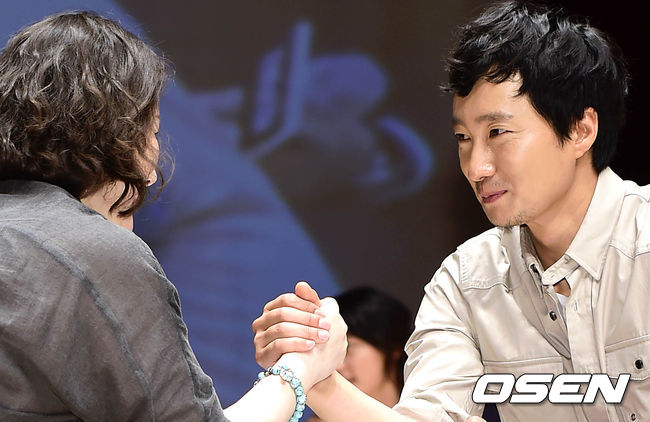 11일 오후 서울 성북구 성신여자대학교 운정그린캠퍼스 대강당에서 열린 영화 '제보자' 쇼케이스에서 배우 박해일이 팬과 팔씨름 대결을 펼치고 있다.