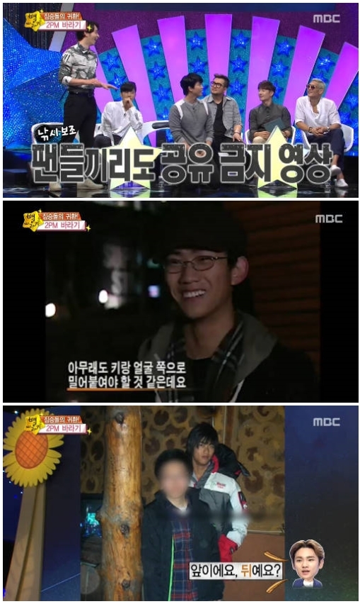 이날 2PM의 과거 영상과 사진이 전파를 탔다. 앳된 얼굴로 "키와 얼굴로 밀어붙이겠다"는 말을 하는 영상이나 부스스한 헤어스타일을 한 옥택연의 모습이 웃음을 안겼다. 연달아 자신의 모습이 공개되자 "왜 나만 그러냐"며 속상해 했다.