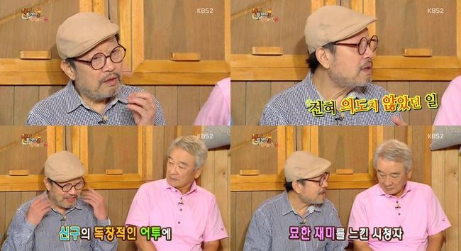 신구는 11일 오후 방송된 KBS 2TV 예능프로그램 '해피투게더3'에서 "유행을 시키려고 의도한 것은 아니다"라고 말했다.