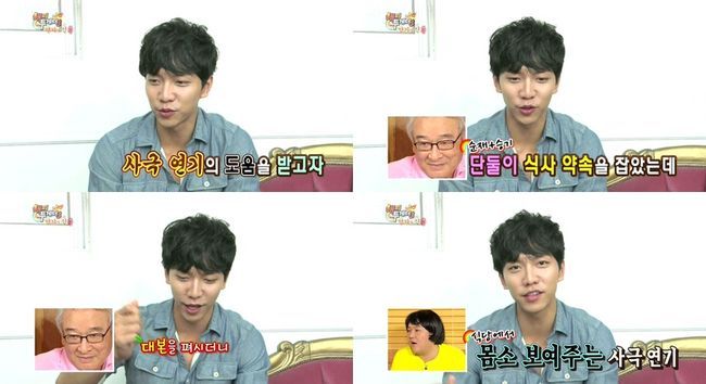 이승기는 11일 오후 방송된 KBS 2TV 예능프로그램 '해피투게더3'에서 영상메시지를 통해 "몸소 연기를 보여주시며 가르쳐주셔서 감사했다"고 밝혔다.
