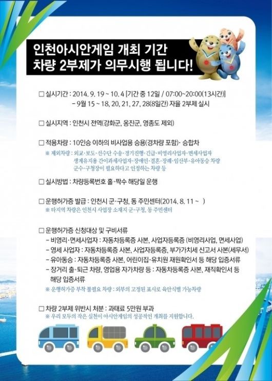 인천시는 대회 기간인 9월 19일부터 10월 4일까지 인천 도심(강화군·옹진군·영종도 제외)에서 차량 2부제를 실시한다고 밝혔다.