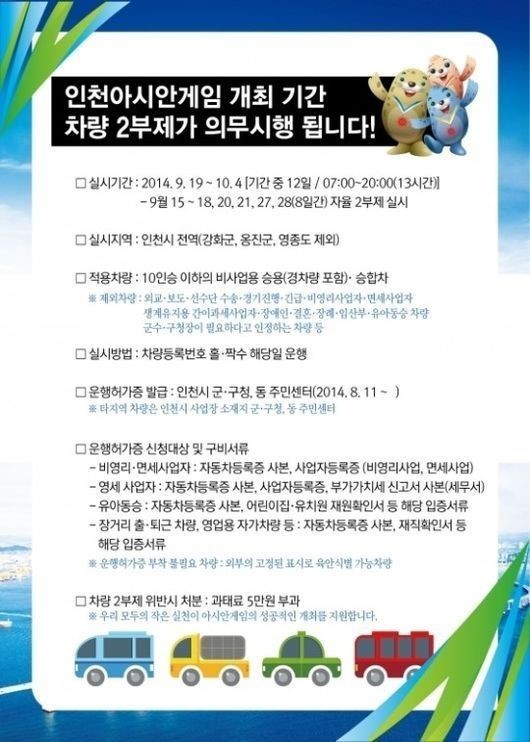 인천시는 대회 기간인 9월 19일부터 10월 4일까지 인천 도심(강화군·옹진군·영종도 제외)에서 차량 2부제를 실시한다고 밝혔다.