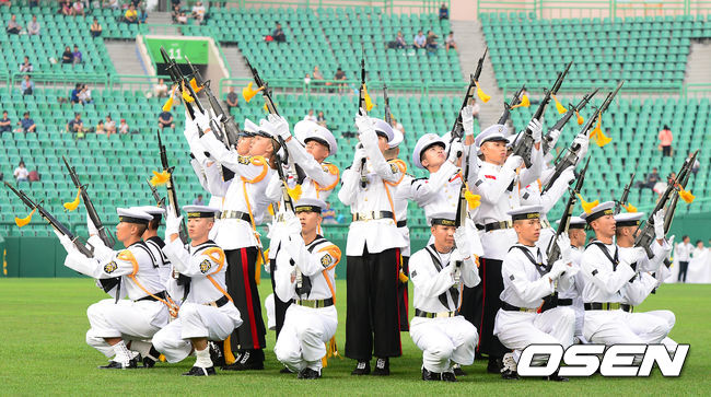 12일 오후 인천 문학구장에서 열린 '2014 한국야쿠르트 세븐 프로야구 SK 와이번스와 넥센 히어로즈의 경기, 경기시작전 인천상륙작전 메모리얼 데이를 기념하여 군악대가 멋진 군무를 선보이고 있다.